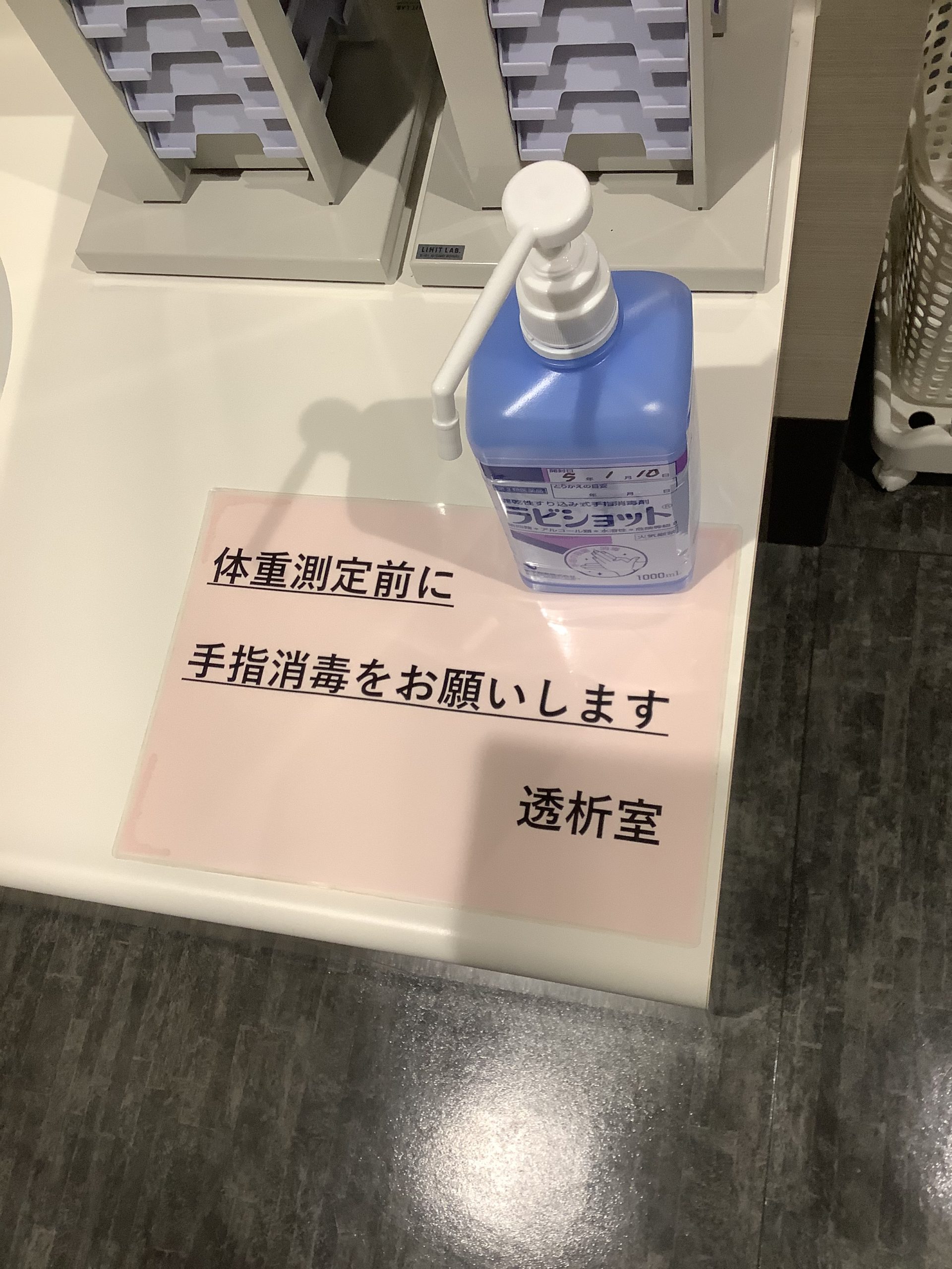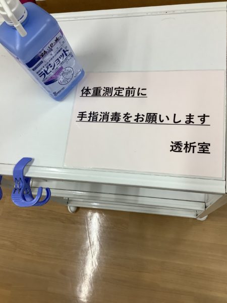 透析室にもいろいろな場所に常備されており、頻繁に利用しています!迷惑をお掛けしていますが、外来の患者様にも消毒をお願いしております…