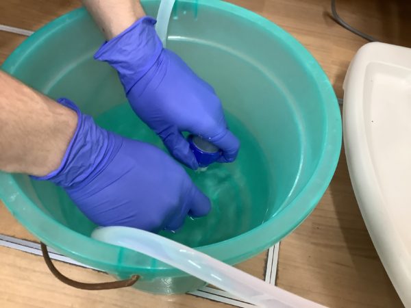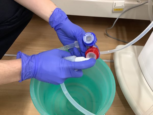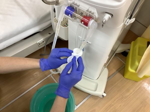 今日は透析のときに腎臓の代わりをする物に透析液を送るホースの洗浄をしました。