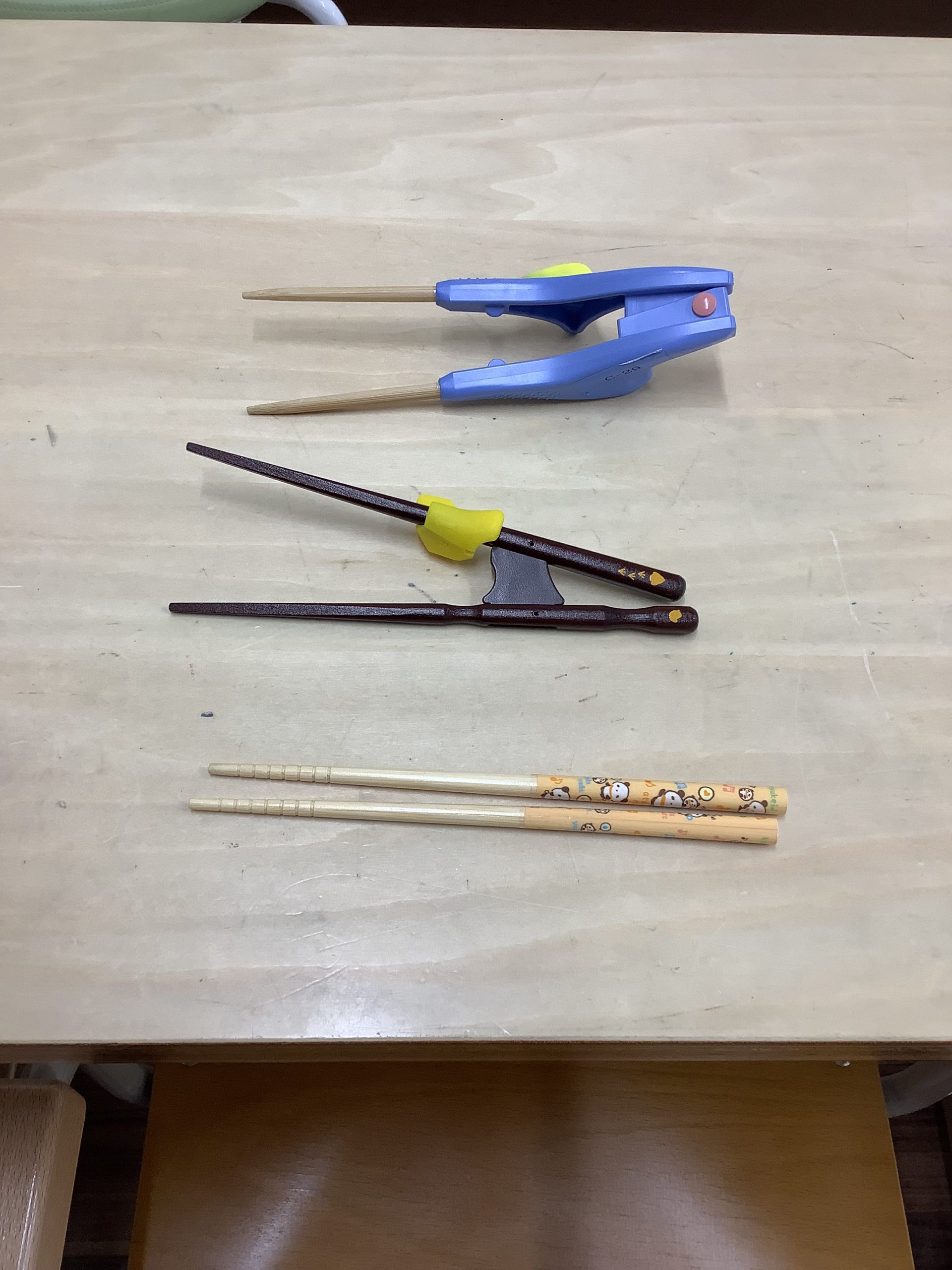 訓練では、いろいろな箸使用して、段階を踏んで進めています。