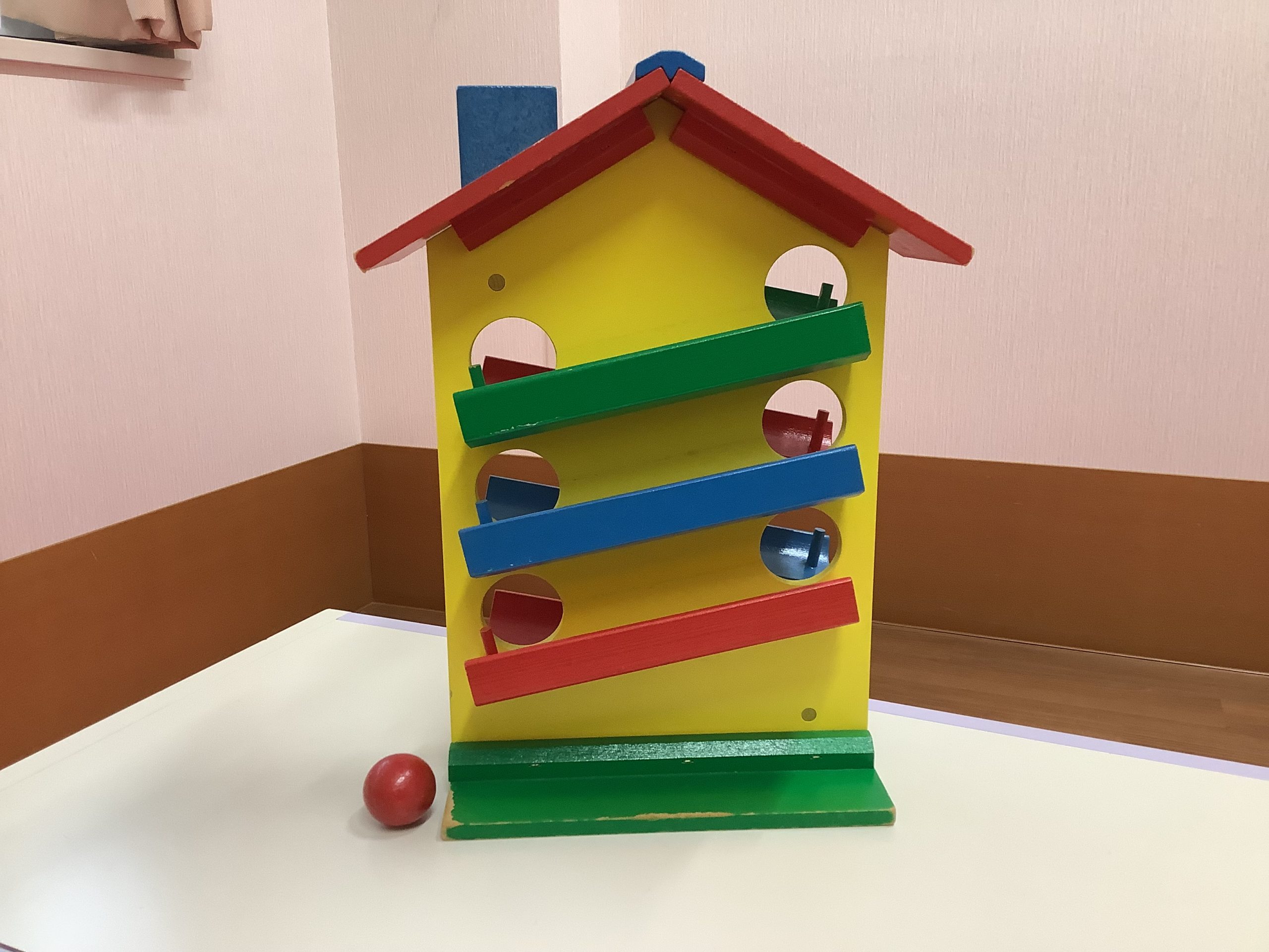 このおもちゃはお家の形になっていて、煙突からボールを入れると転がっていきます。カタカタと音が鳴って楽しんで遊んでくれる子が多く、これを使って、追視ややりとりの練習などをしています。