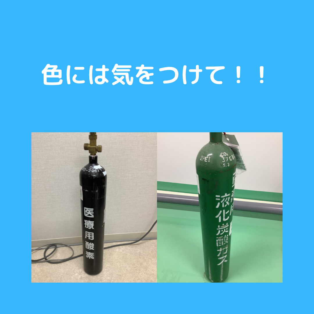 よく酸素の配管の色と間違えてしまう事で有名な二酸化炭素のボンベですが、どうしてこんな配色になったかというとボンベの色を管理している規格と中央配管の色を管理している規格が違うからだそうです。😅