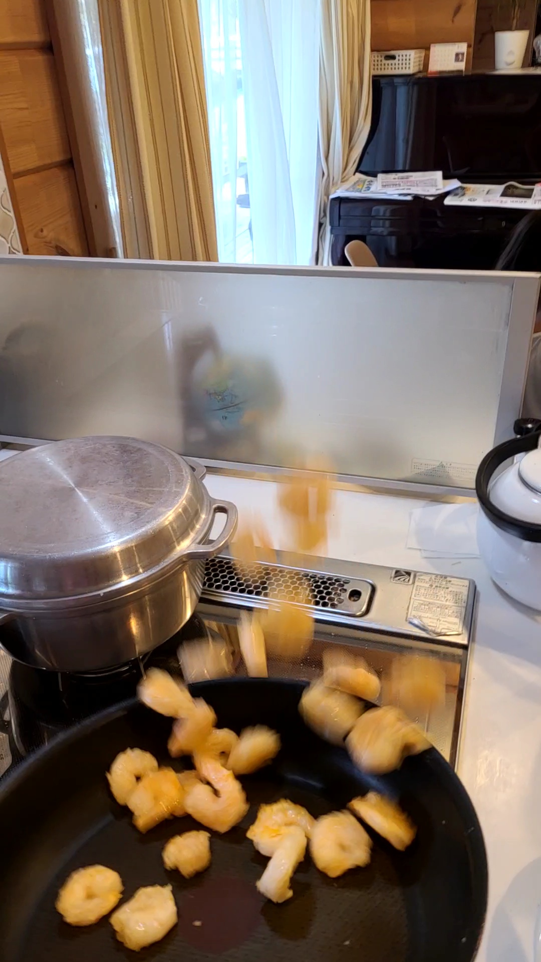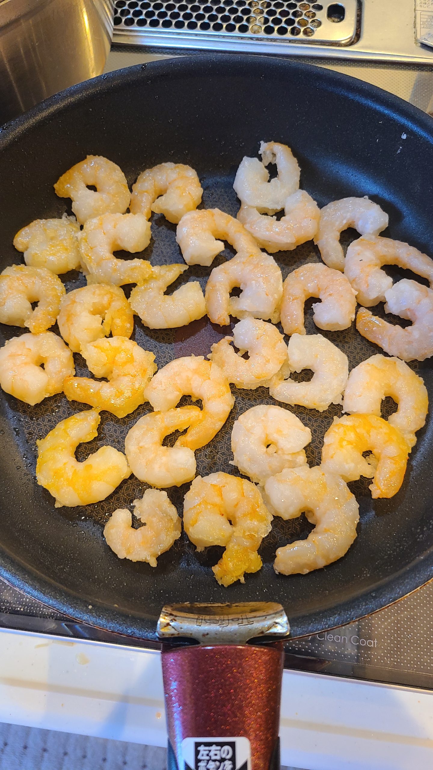 ご覧の通り、実はこのエビ一度ほとんどフライパンの外に落としております。