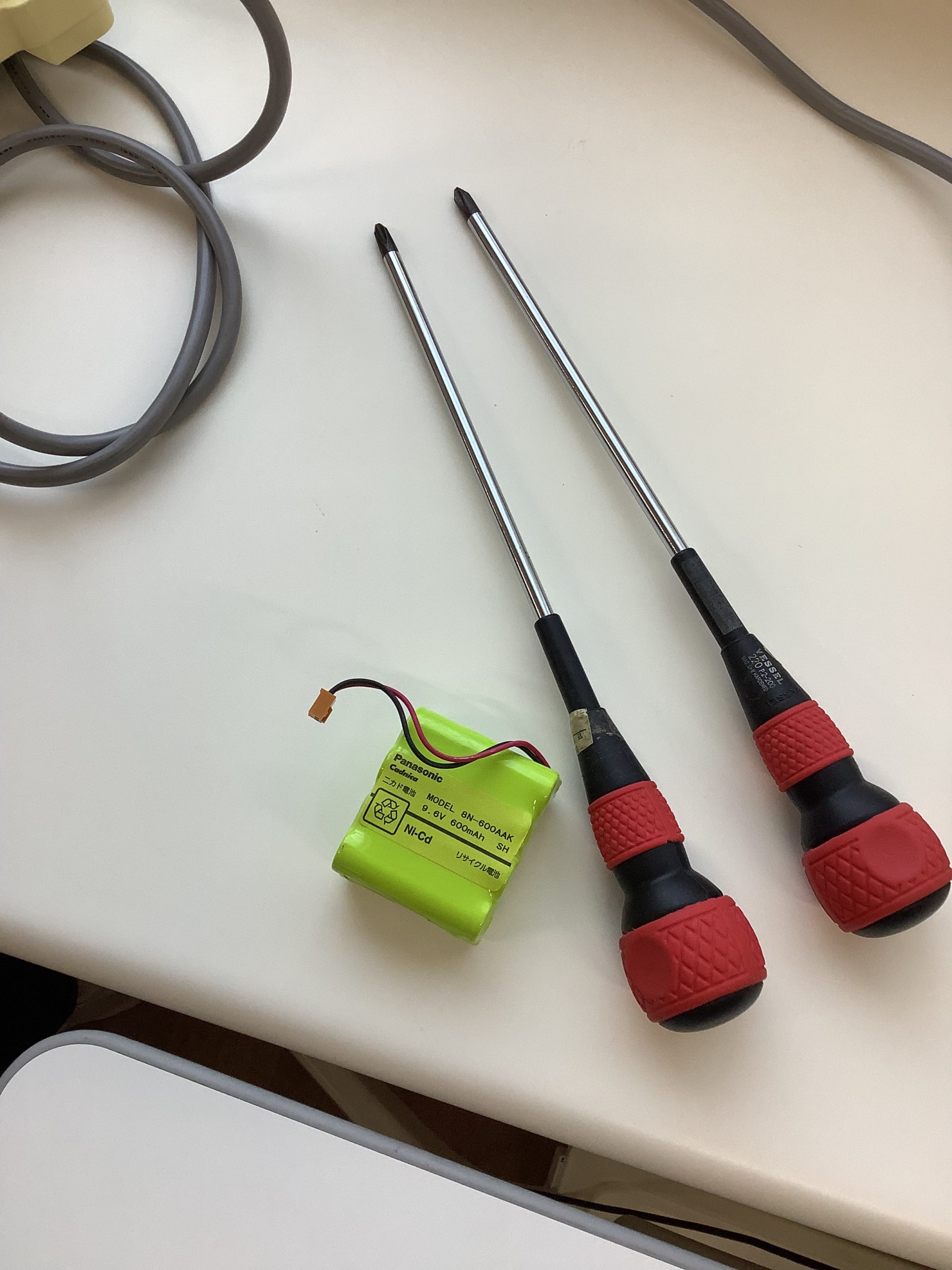 写真に映るのはバッテリー交換の様子です。緑の大きいのが電池となるものです。