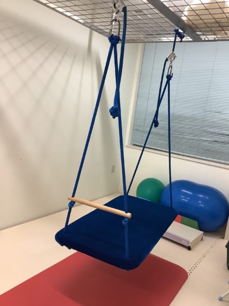 作業療法の訓練では、粗大運動として、大きなブランコ(オーシャンスイング)を使用した感覚運動遊びなども実施します。お子さんの中で感覚が鈍麻な子や過敏な子と様々ですが、このブランコは喜んで乗ってくれる子が多いです。